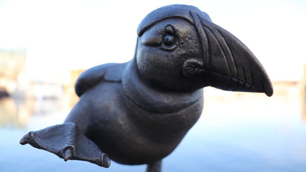 The Running Puffin is a bronze statue of a real-size Puffin, designed by Suzie March and is a gift from Silversea Expeditions.