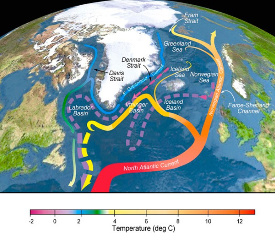 Warmer waters in the Atlantic are transported northward with ocean currents and bathe Svalbard in warmer waters.
